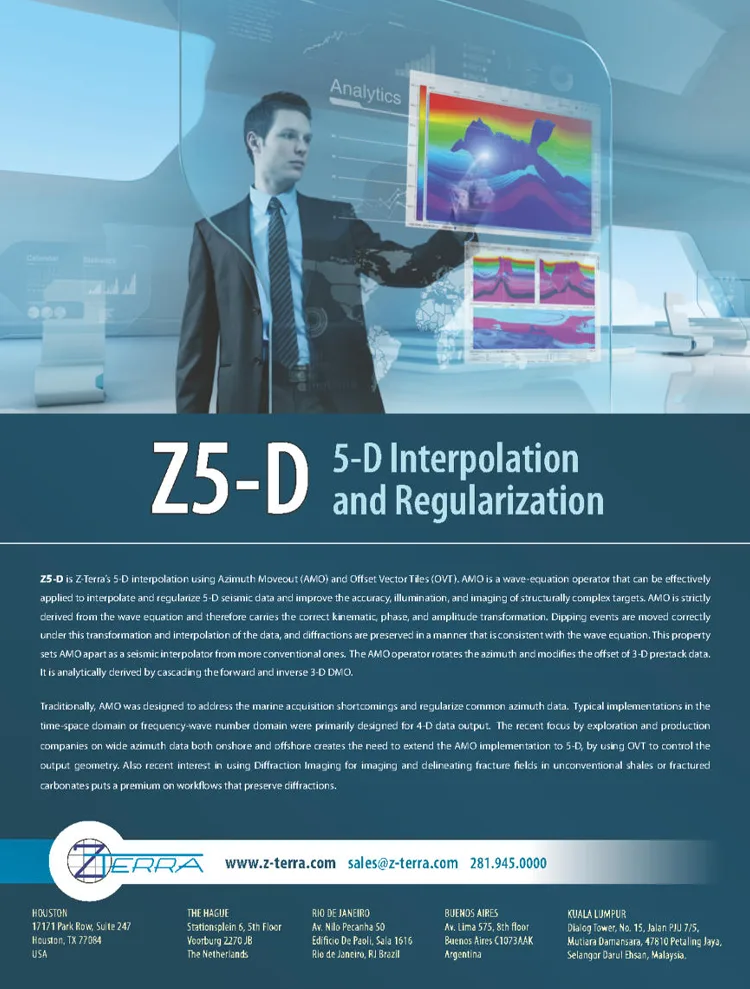 Z5-D is Z-Terra’s 5-D interpolation using Azimuth Moveout (AMO) and Offset Vector Tiles (OVT). AMO is a wave-equation operator that can be effectively applied to interpolate and regularize 5-D seismic data and improve the accuracy, illumination, and imaging of structurally complex targets. AMO is strictly derived from the wave equation and therefore carries the correct kinematic, phase, and amplitude transformation. Dipping events are moved correctly under this transformation and interpolation of the data, and diffractions are preserved in a manner that is consistent with the wave equation. This property sets AMO apart as a seismic interpolator from more conventional ones. The AMO operator rotates the azimuth and modifies the offset of 3-D prestack data.