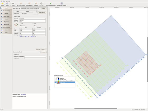 Users can quickly QC the survey geometry and control the input data geometry and grid definition with the base map viewer and view the input data and trace header information, 2-D and 3-D velocity models, travel times, stacks, and gathers with the data viewer.