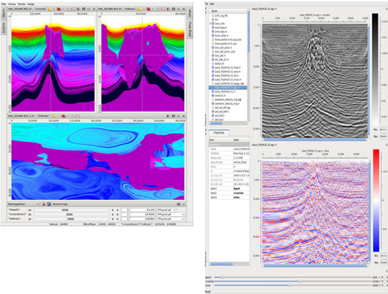 The multidimensional data viewer can display and synchronously scroll through up to nine volumes from the same survey. For example, users may synchronously scroll through inline, crossline, and depth sections through the velocity model, travel times, stacks, and gathers.