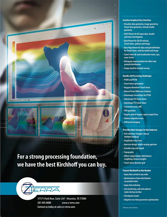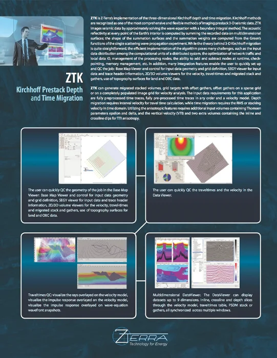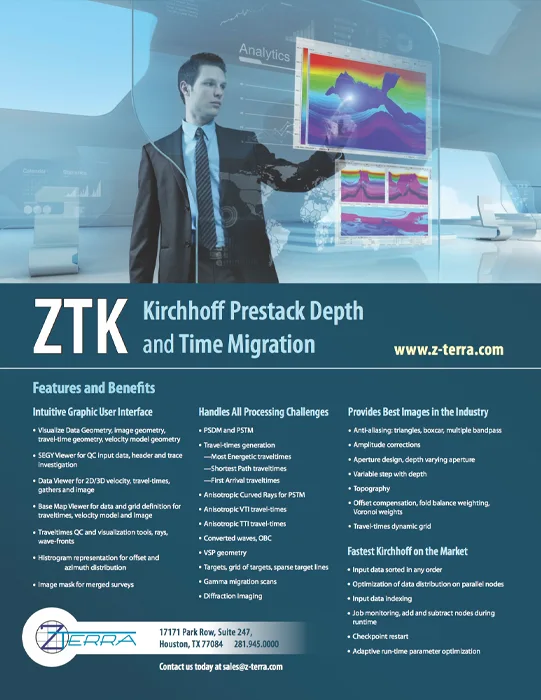 Kirchhoff methods are widely recognized as one of the most comprehensive and flexible methods of imaging prestack 3-D seismic data. ZTK is Z-Terra’s implementation of three-dimensional Kirchhoff migration in depth and in time. ZTK images seismic data by approximately solving the wave equation with a boundary integral method. The acoustic reflectivity at every subsurface image point is computed by summing the recorded data on multidimensional surfaces; the shape of the summation surfaces and the summation weights are computed from Green’s functions of the single scattering wave propagation experiment.